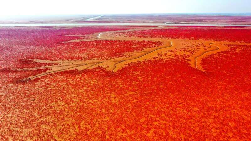 绵延不绝的翅碱蓬把广袤的滩涂染成红色。新华社记者 郭绪雷 摄