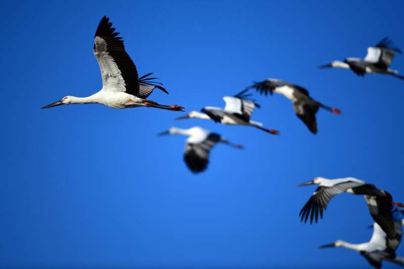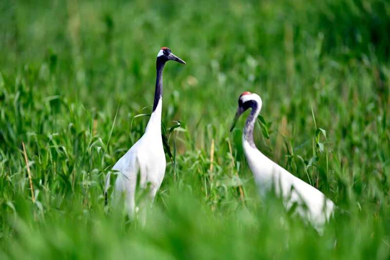 记者探访保护区看到,丹顶鹤步履优雅,白鹤、疣鼻天鹅和白琵鹭正低空盘旋,性格孤僻的东方白鹳除了外出觅食,多数时候一雌一雄静静地守在巢穴里……