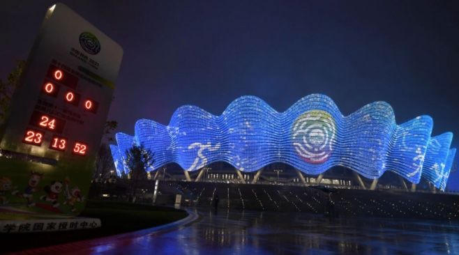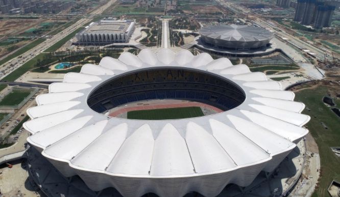 西安奥体中心是第十四届全国运动会主场馆、坐落于西安国际港务区的灞河之畔,总占地1089亩,总建筑面积52万平方米,由“一场两馆”三座主体建筑构成,可容纳8.2万名观众。场馆于2017年10月9日启动建设,于2020年7月1日建成交付投用。