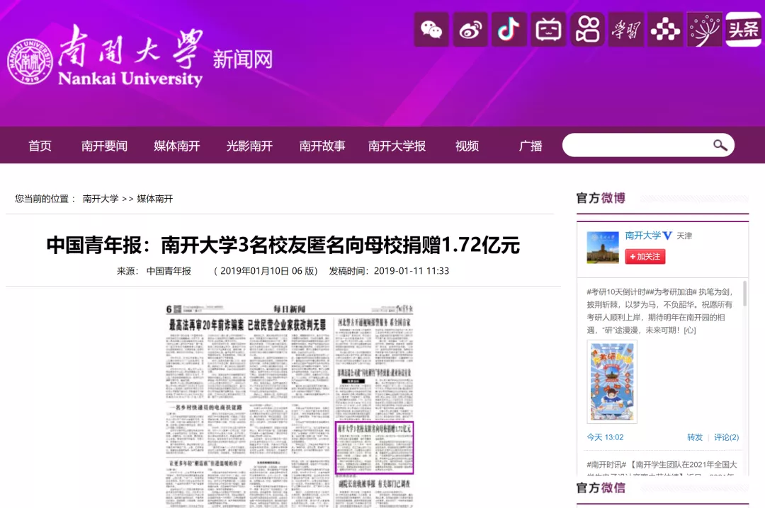 2019年1月,南开大学3位匿名企业家校友向南开捐赠人民币1.72亿元,用于学校数学、大数据、人工智能、金融、国际经济等学科的发展建设。