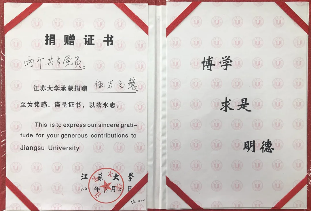 今年5月,江苏大学党委收到一封署名“两个共产党员”的信件,写信人捐款50万元,在学校设立“两个共产党员奖学基金”,用以奖励优秀学生成长成才。