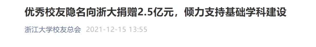 据浙江大学校友总会今日发布的消息,一位优秀校友隐名向浙大捐赠2.5亿元。