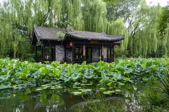 然都人游踪,多集于什刹海,以其去市最近,故裙屐争趋。长夏夕阴,火伞初敛。柳荫水曲,团扇风前。几席纵横,茶瓜狼藉。玻璃十顷,卷浪溶溶。菡萏一枝,飘香冉冉。想唐代曲江,不过如此。——(清)震钧《天咫偶闻》