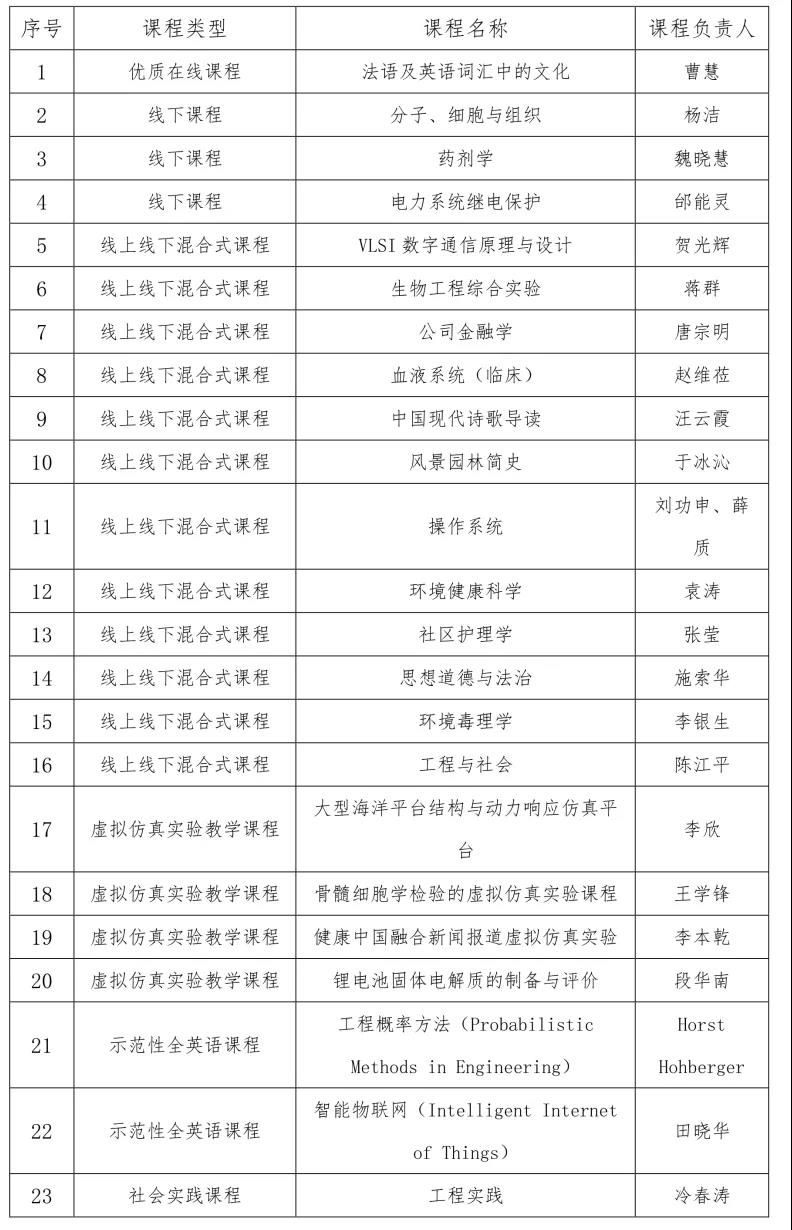 近日,上海市教育委员会公布了《2021年度上海高等学校一流本科课程认定结果》(沪教委高[2021]66号)。上海交通大学23门课程入选2021年度上海市高等学校一流本科课程,其中优质在线课程1门,线下课程3门,线上线下混合式课程12门,虚拟仿真实验教学课程4门,社会实践课程1门,示范性全英语课程2门。