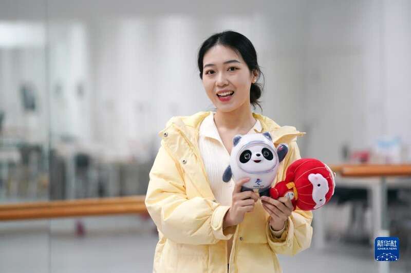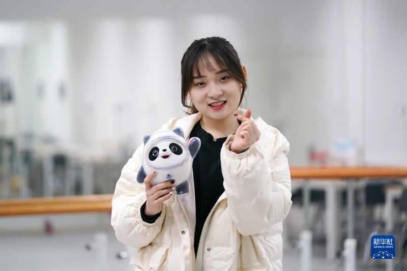 北京邮电大学的学生志愿者曹梦鸽手捧北京2022年冬奥会和冬残奥会吉祥物做自我介绍(12月15日摄)。