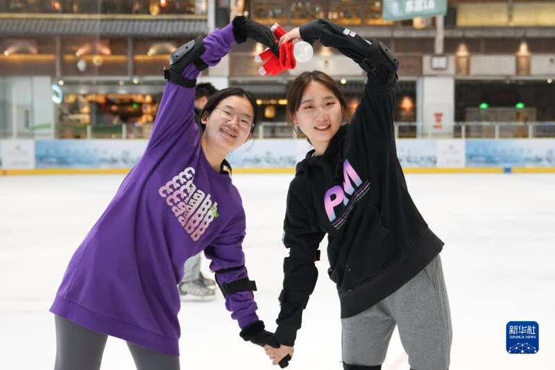 清华大学的学生志愿者孙源源(右)和来姗姗在清华大学“冬奥精神与青年志愿”课程上体验滑冰(12月14日摄)。