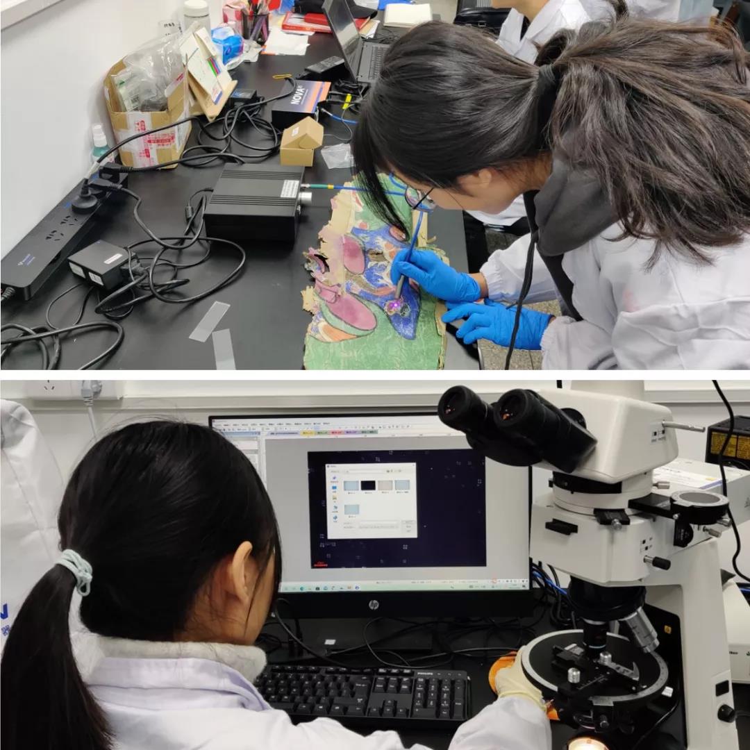 上:对一幅清代套印年画残片进行无损光谱分析;下:使用偏光显微镜观察石器的残留物