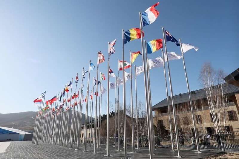 12月22日,张家口冬奥村村口飘起各参赛代表团旗帜。新华社记者杨帆摄