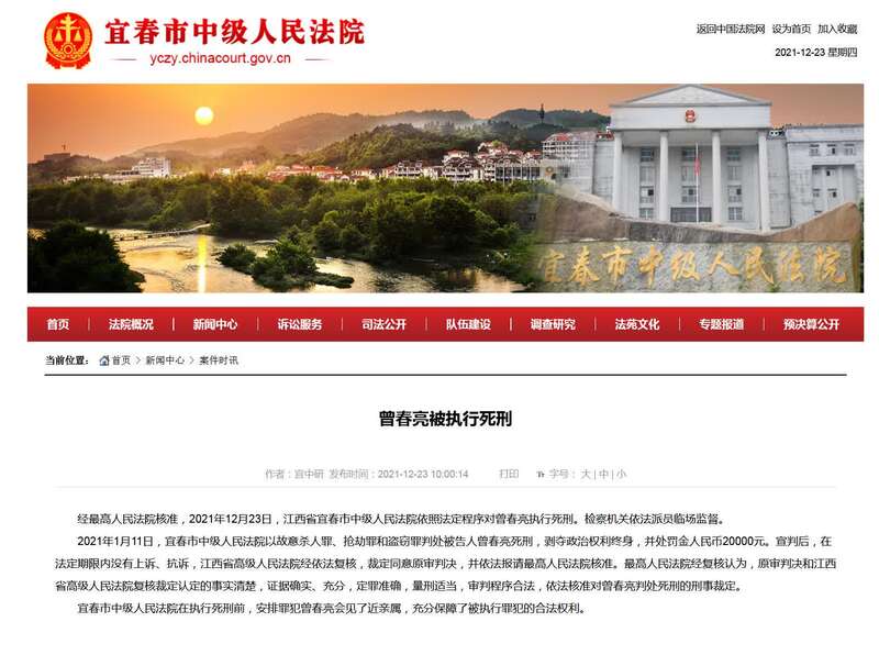 据江西省宜春市中级人民法院网站消息,经最高人民法院核准,2021年12月23日,江西省宜春市中级人民法院依照法定程序对曾春亮执行死刑。检察机关依法派员临场监督。