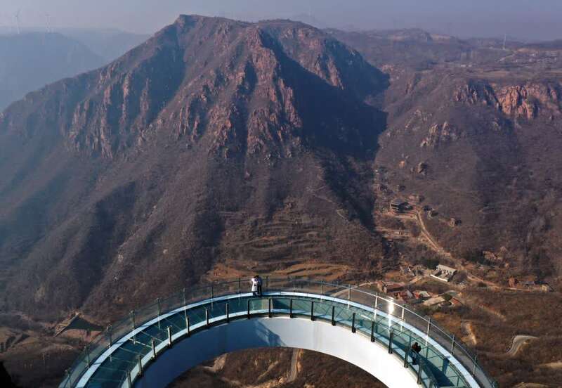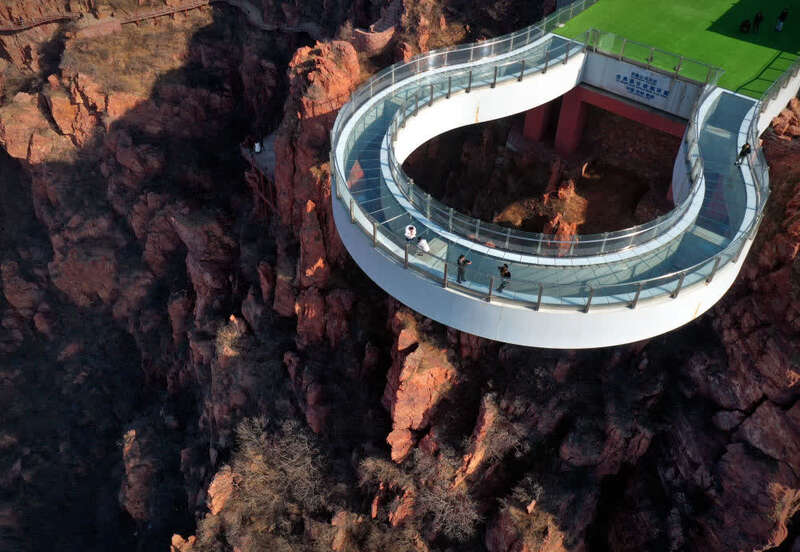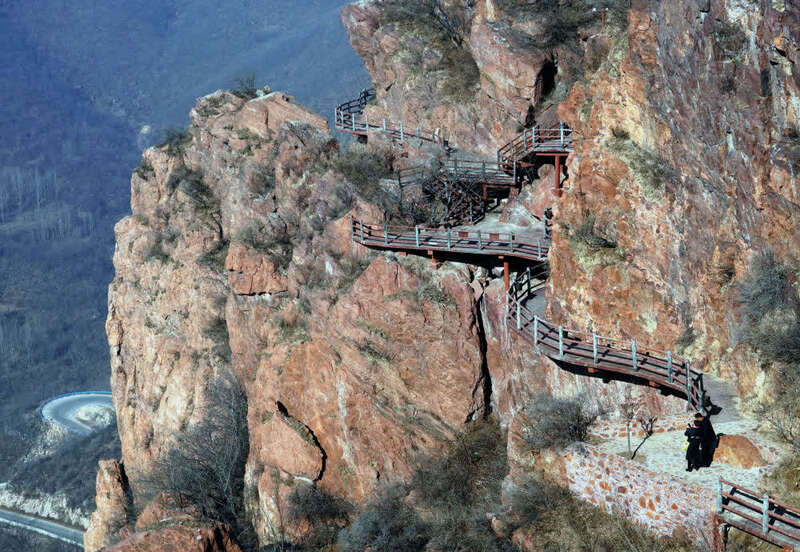 ↑12月22日,游客在河南新密市伏羲山旅游区红石林景区内的空中环廊游览。