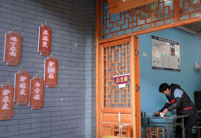 ↑12月22日,在河南新密市伏羲山旅游区红石林景区,尖山村村民丁秀荣在自己开设的餐馆内打扫卫生。