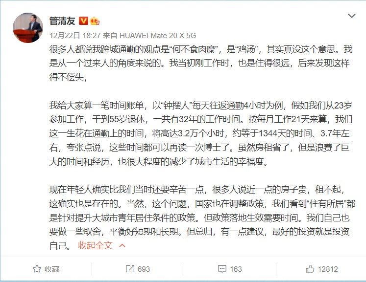 日前,经济学家管清友的一番言论引起了网民的热议。他认为,年轻人在刚刚参加工作的时候,要把时间有效利用好,与其每天上班两个小时通勤,不如在公司附近租房子住,这比在偏远的郊区买一个房子更划算,投资自己的回报率是最高的。
