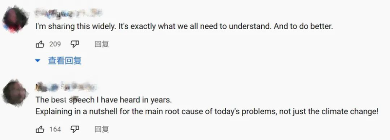 “这是我近些年听过最好的演讲,言简意赅地解释了当今问题的根源,并不局限于气候变化方面。”