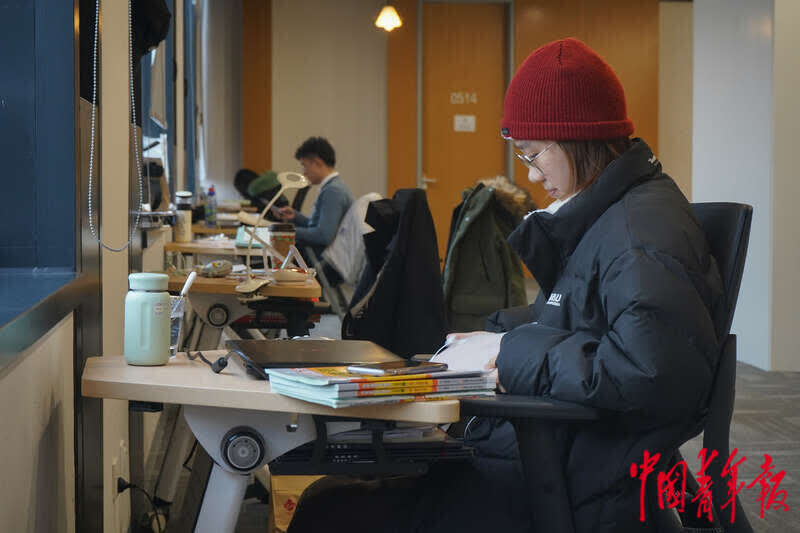 12月23日,北京,中国人民大学立德楼内,商学院大四学生于小迪在窗前复习,她的目标是跨校考取北京电影学院的电影制片与管理专业硕士。她发现自己求职时,就业动机并不充分,只是“单纯地出于想要财务独立的愿望”。实习时,导师也鼓励她考研。她认为,既然已经找到了方向,就要努力去拼一把。但她不强求“一战上岸”,看过之前几届师兄师姐成功的概率后,她认为自己“二战”的把握会更充足。“世界这么大,今年考不上也没关系。”于小迪说。张未/摄