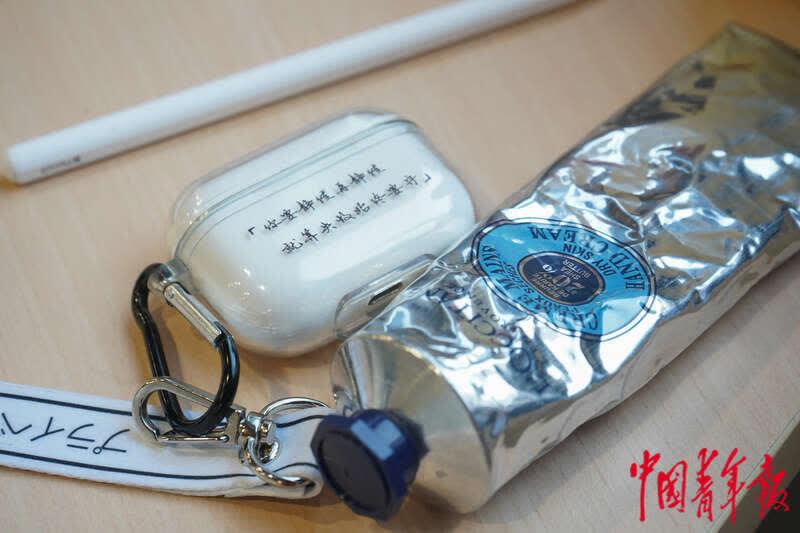 12月23日,北京,中国人民大学立德楼内,一名考研人桌子上摆着耳机与护手霜。耳机壳上写着:“你要静候再静候,就算失败始终要守”。张未/摄