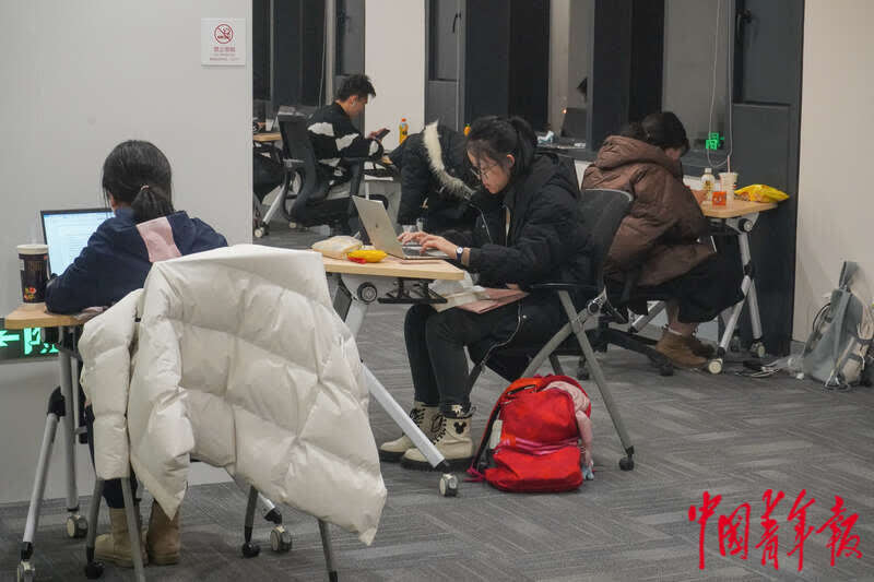 12月23日晚11点,北京,中国人民大学立德楼内,同学们在通宵自习室外的公共空间自习。这栋教学楼于今年9月开放,公共空间的窗边坐满了考研复习的学生。不少同学看中了窗边开阔的视野,同时,宽敞的公共空间也让考研人们免去了复习时频繁寻找空教室的烦恼。距开考日越来越近,考生复习进入冲刺阶段。2022年全国硕士研究生招生考试将于12月25日至27日举行。近年来,全国硕士研究生招生考试报考人数连年增加,今年全国报考人数为457万人,较2021年的371万人同比增长了21.22%,再创历史新高。张未/摄