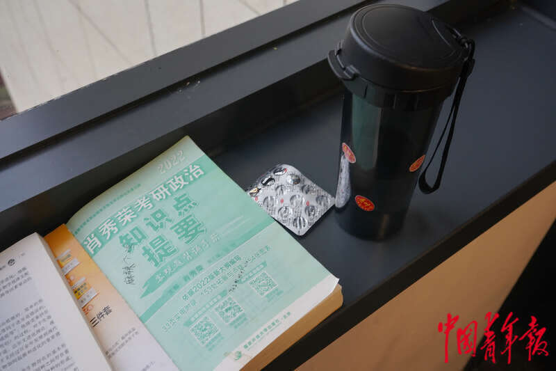 12月23日,北京,中国人民大学立德楼内,郭傲利所在的学习窗台上,除了书本之外还摆着水杯和肠炎宁片。由于肠胃炎,郭傲利最近需要一直吃药。张未/摄