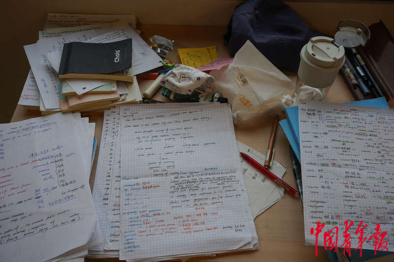 12月23日,北京,中国人民大学立德楼内,陈东杨的书桌上摆着文具与生活用品,纸上写着密密麻麻的英语笔记。张未/摄