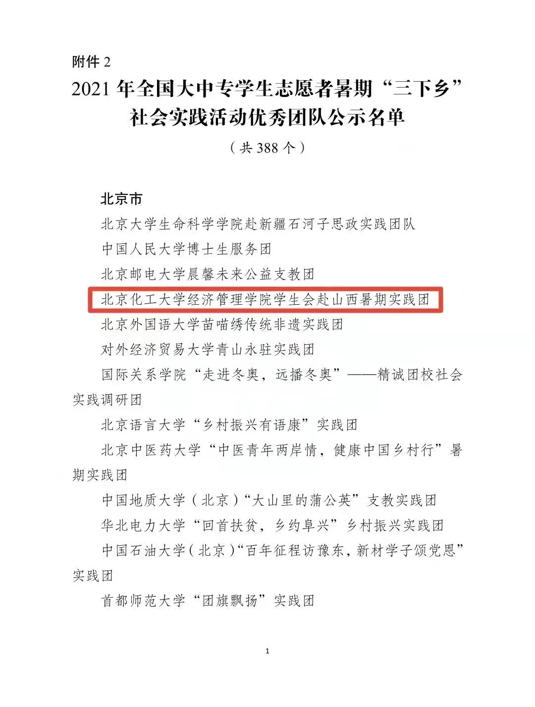 近日,团中央、全国学联秘书处对2021年参与全国大中专学生志愿者暑期“三下乡”社会实践活动的集体和个人进行了评选,我校经济管理学院学生会赴山西暑期社会实践团从全国众多申报团队中脱颖而出,获评 全国优秀团队 。