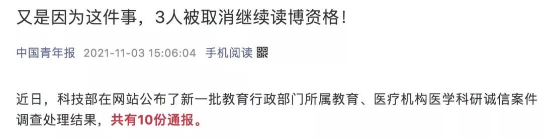 在科技部12月公布的医学科研诚信案件调查处理结果中,多人因论文代写代投,被取消继续攻读博士学位资格。
