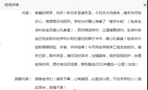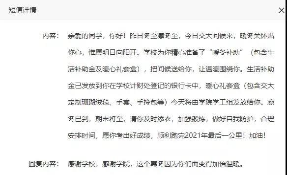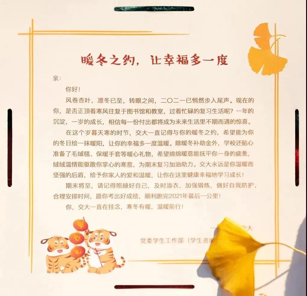 暖冬之约,让幸福多一度。暖冬补助是学校“学党史、办实事”系列活动的重要环节,体现着学校对学生无微不至的关怀与呵护。交大是同学们的第二个家,是身心疲惫时可供休憩的港湾,也是乘风破浪时最有力的保障,愿同学们都能在这温暖的校园里安心学习,高歌猛进,砥砺前行,早日实现与交大的双向赴约!