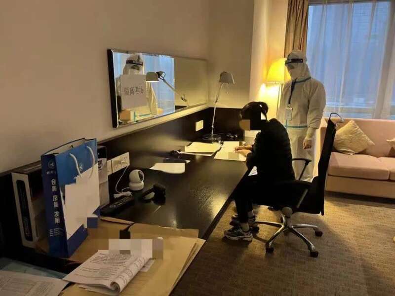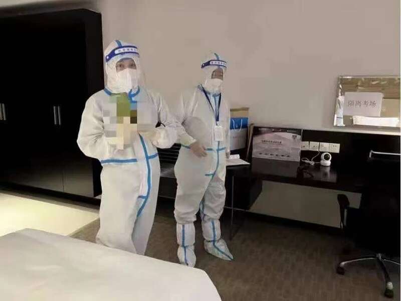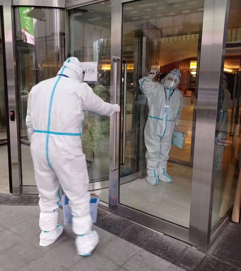 两位老师在酒店外穿好防护服,熟练做好防护措施后,提前进入酒店的隔离考场。这套流程,他们已在事前培训中演练不下10遍,在心里更是反复模拟推敲。虽然这场特殊监考前所未有,但两位老师并不是特别担心。因为早在前一天,他们便与考生小杨通过视频电话,告知流程并了解了学生健康情况。