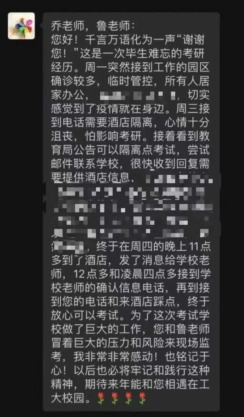 “那一刻,我们很感动!感到所有的辛苦都是值得的。”两位老师动情地说。“这是一次难得的经历,也是我们作为党员应尽的责任,预祝所有考生一切顺利!成功考上!”由于考生是B类密接人员,按疫情防控要求,在结束监考后,鲁卫平、乔彩燕两位老师要在监考酒店就地隔离14天。