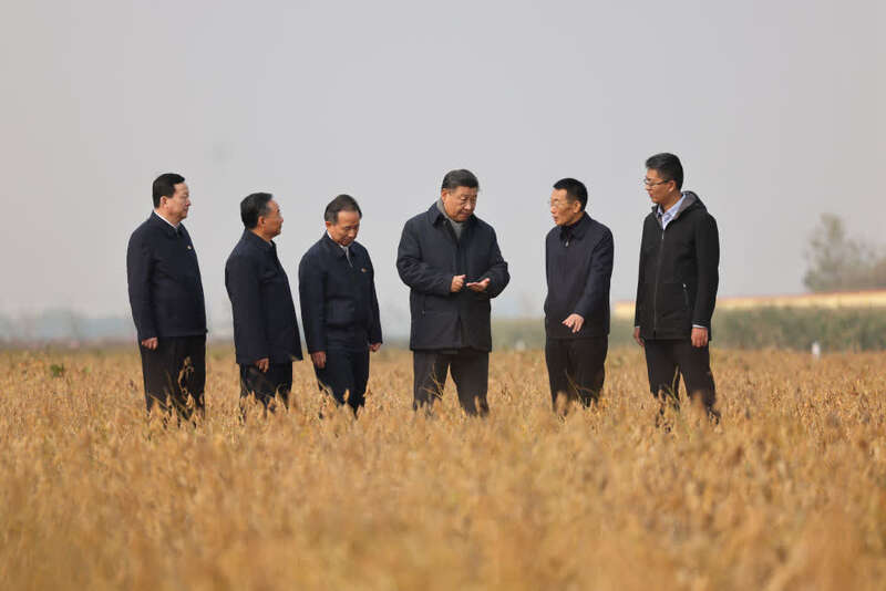 这是2021年10月21日上午,习近平总书记在东营市黄河三角洲农业高新技术产业示范区考察时,走进田间察看大豆长势。新华社记者 王晔 摄