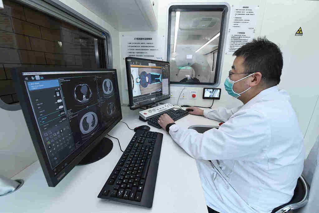 12月27日,河南省洛阳市,在孟津区人民医院内,工作人员在“移动CT+核酸快速检测一体化医疗车”上调试设备。