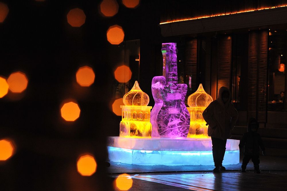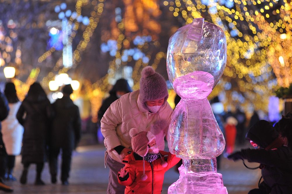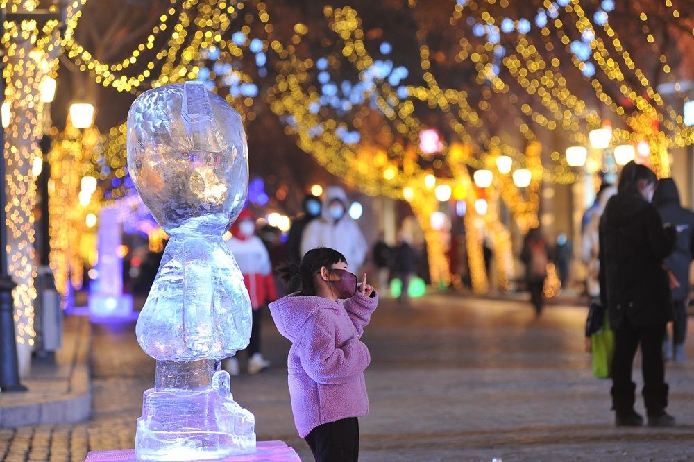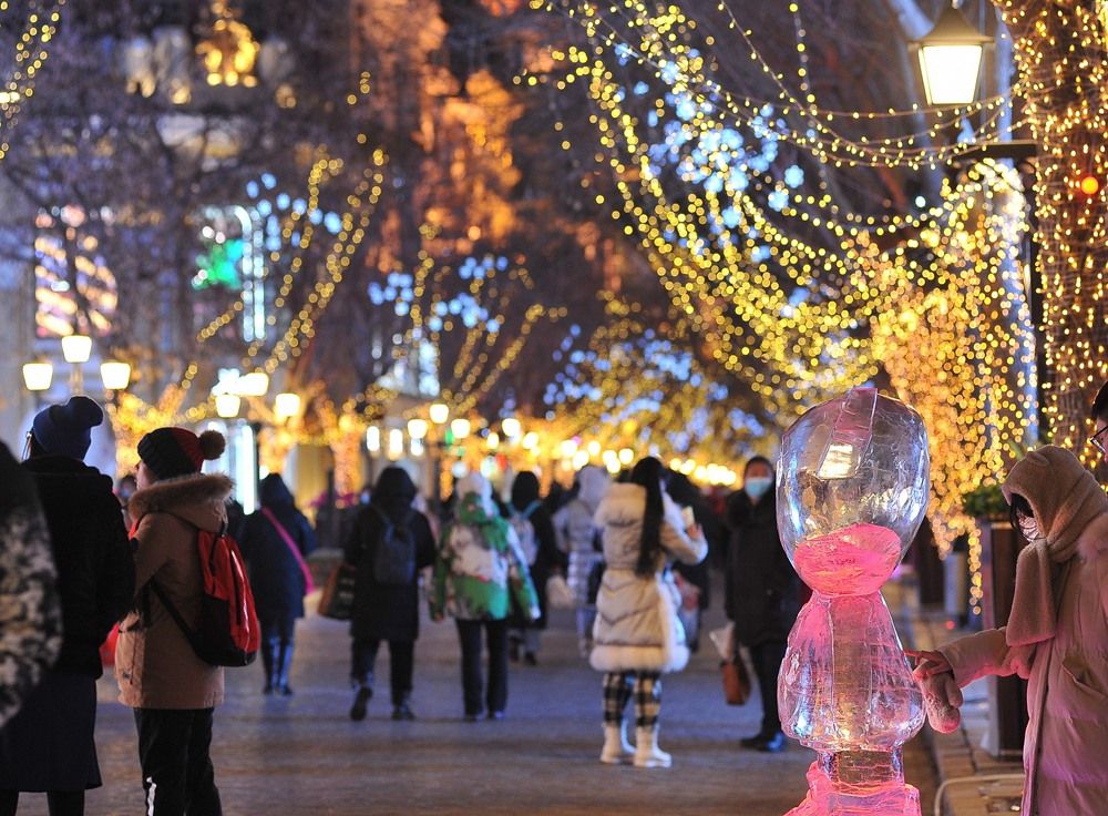 2021年12月28日,夜幕降临,哈尔滨市道里区中央大街上,冰灯、彩灯交相辉映,在街道两侧欧式建筑衬托下,勾勒出一个迷人浪漫的冬夜。