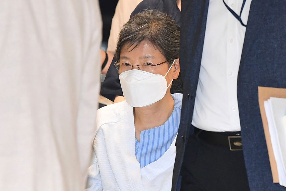 当地时间2021年7月20日,韩国首尔,被拘留的前总统朴槿惠坐轮椅进入首尔一家医院进行治疗。视觉中国 图