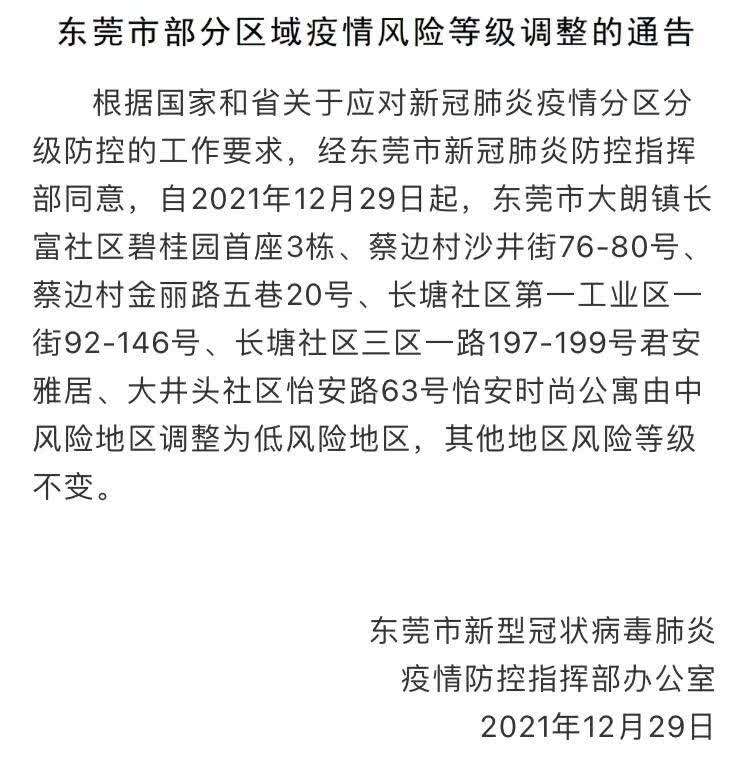 根据国家和省关于应对新冠肺炎疫情分区分级防控的工作要求,经东莞市新冠肺炎防控指挥部同意,自2021年12月29日起,东莞市大朗镇长富社区碧桂园首座3栋、蔡边村沙井街76-80号、蔡边村金丽路五巷20号、长塘社区第一工业区一街92-146号、长塘社区三区一路197-199号君安雅居、大井头社区怡安路63号怡安时尚公寓由中风险地区调整为低风险地区,其他地区风险等级不变。