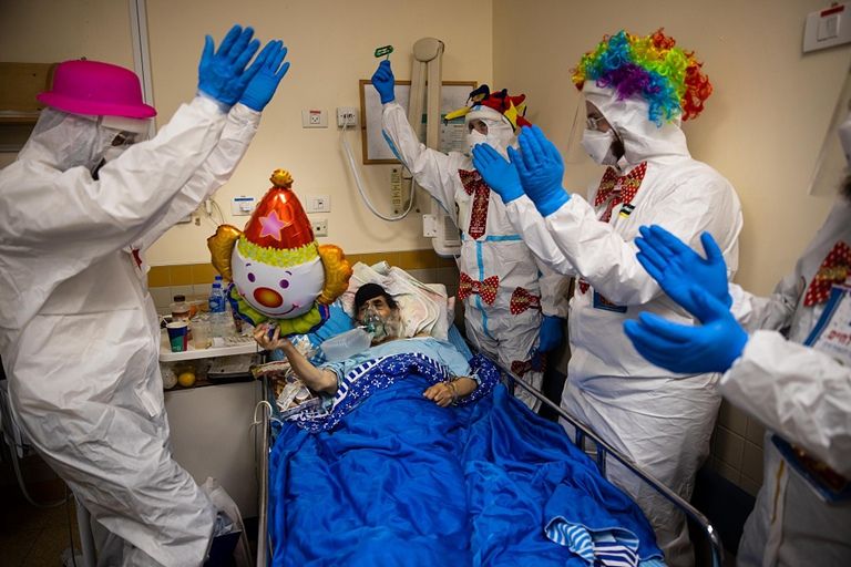 当地时间2021年2月16日,以色列线城市拉马特甘,当地医院内的医护人员们装扮成小丑前往新冠房内为患者们加油打气,鼓励他们战胜病魔。