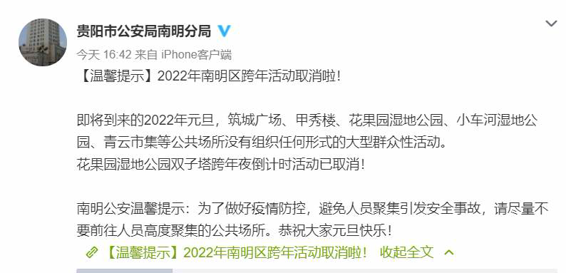 12月30日,贵阳市公安局南明分局发布消息:即将到来的2022年元旦,筑城广场、甲秀楼、花果园湿地公园、小车河湿地公园、青云市集等公共场所没有组织任何形式的大型群众性活动。花果园湿地公园双子塔跨年夜倒计时活动已取消!