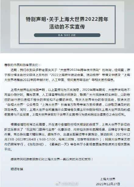 近日,网传“上海大世界将推出2022年跨年倒计时、人工降雪、夜间集市等活动”。12月29日下午,上海大世界对此发布声明: