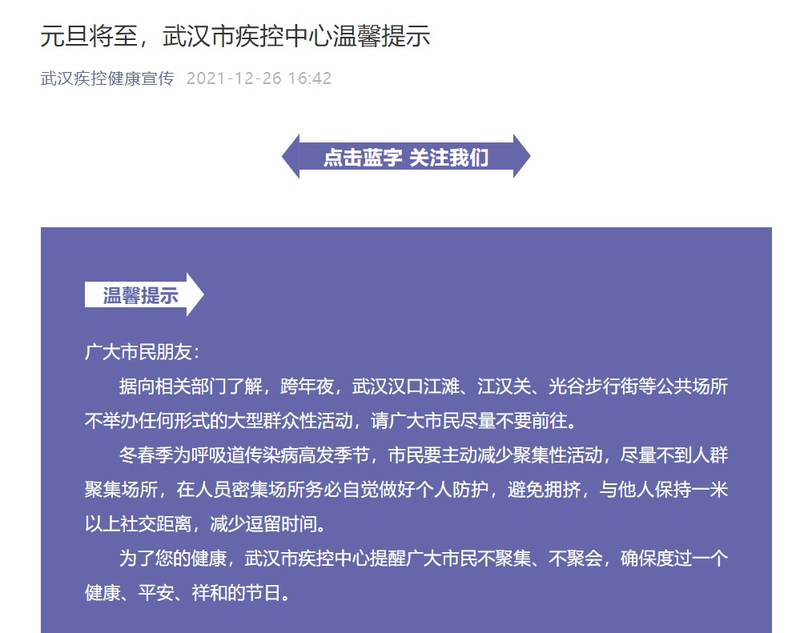 12月26日,武汉疾控发布提醒:据向相关部门了解,跨年夜,武汉汉口江滩、江汉关、光谷步行街等公共场所不举办任何形式的大型群众性活动,请广大市民尽量不要前往。