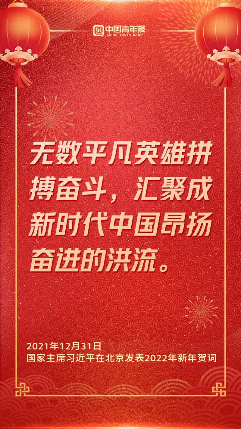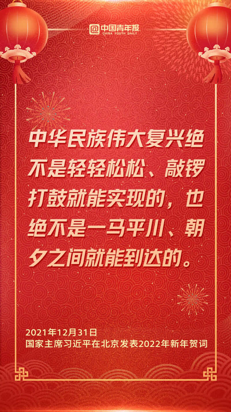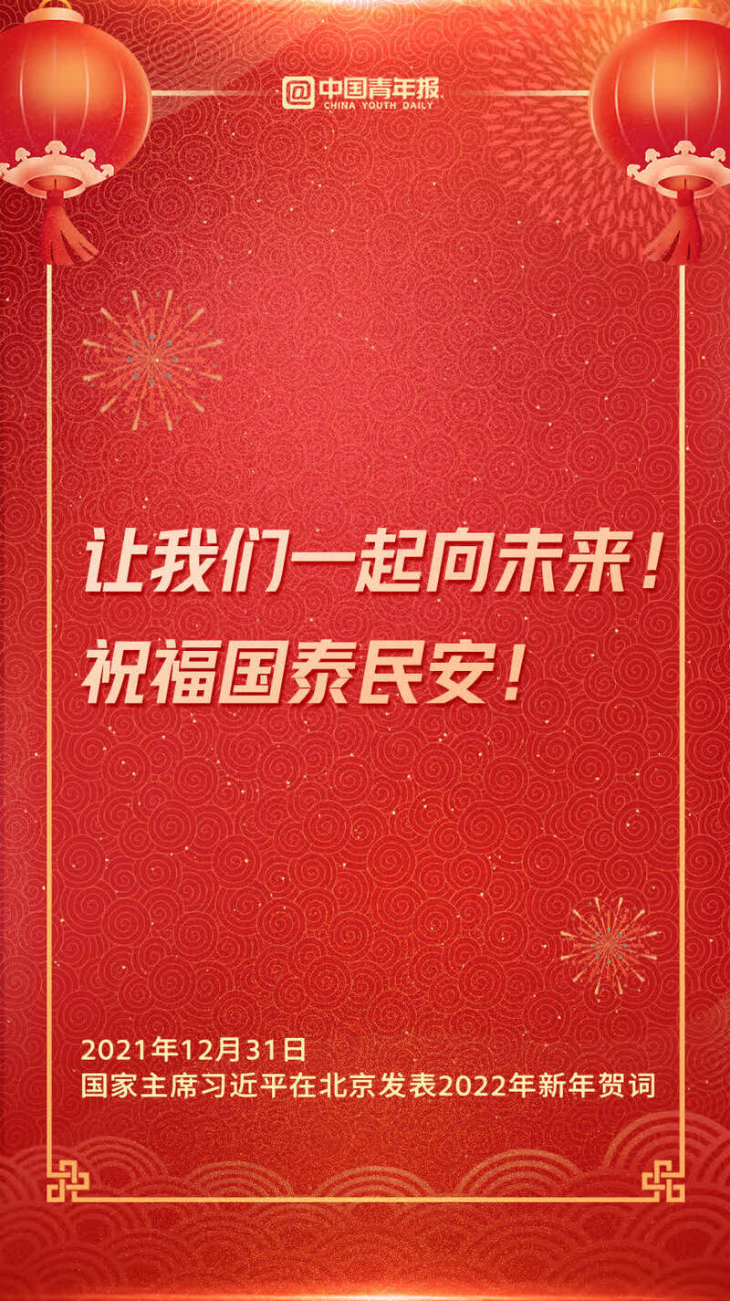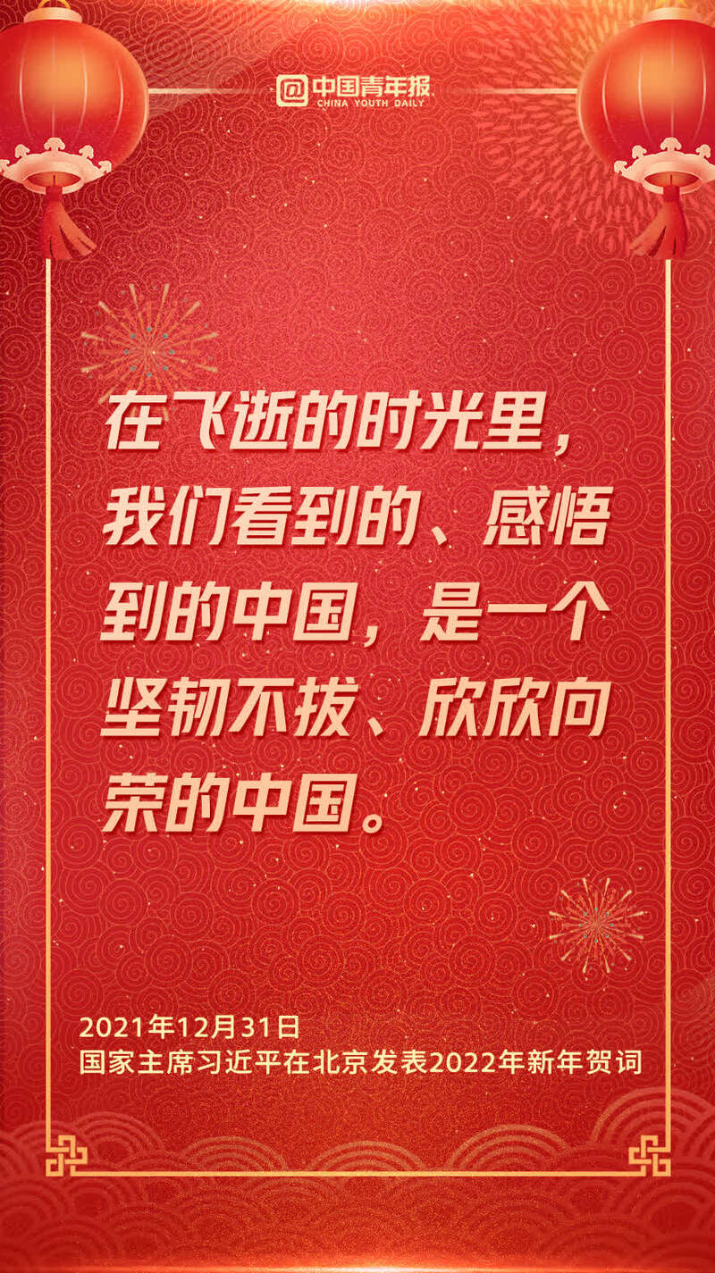 新年前夕,国家主席习近平发表二〇二二年新年贺词。回首这一年,意义非凡。一个坚韧不拔、欣欣向荣的中国开启了全面建设社会主义现代化国家新征程,正昂首阔步行进在实现中华民族伟大复兴的道路上。新年的钟声即将敲响。收藏这份主席新年贺词金句,让我们一起向未来!祝福国泰民安!