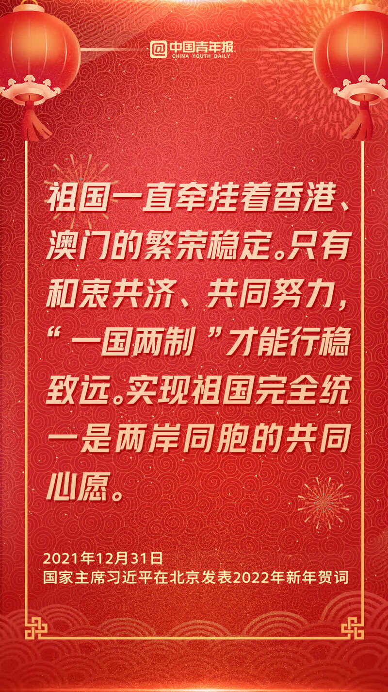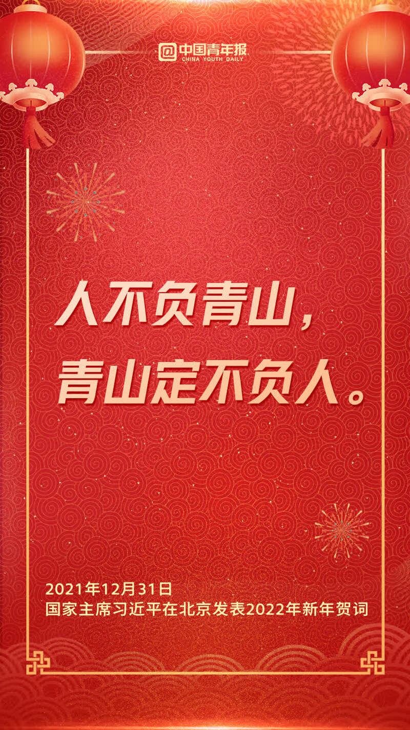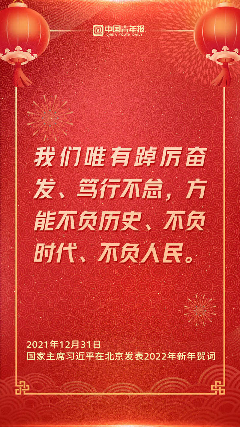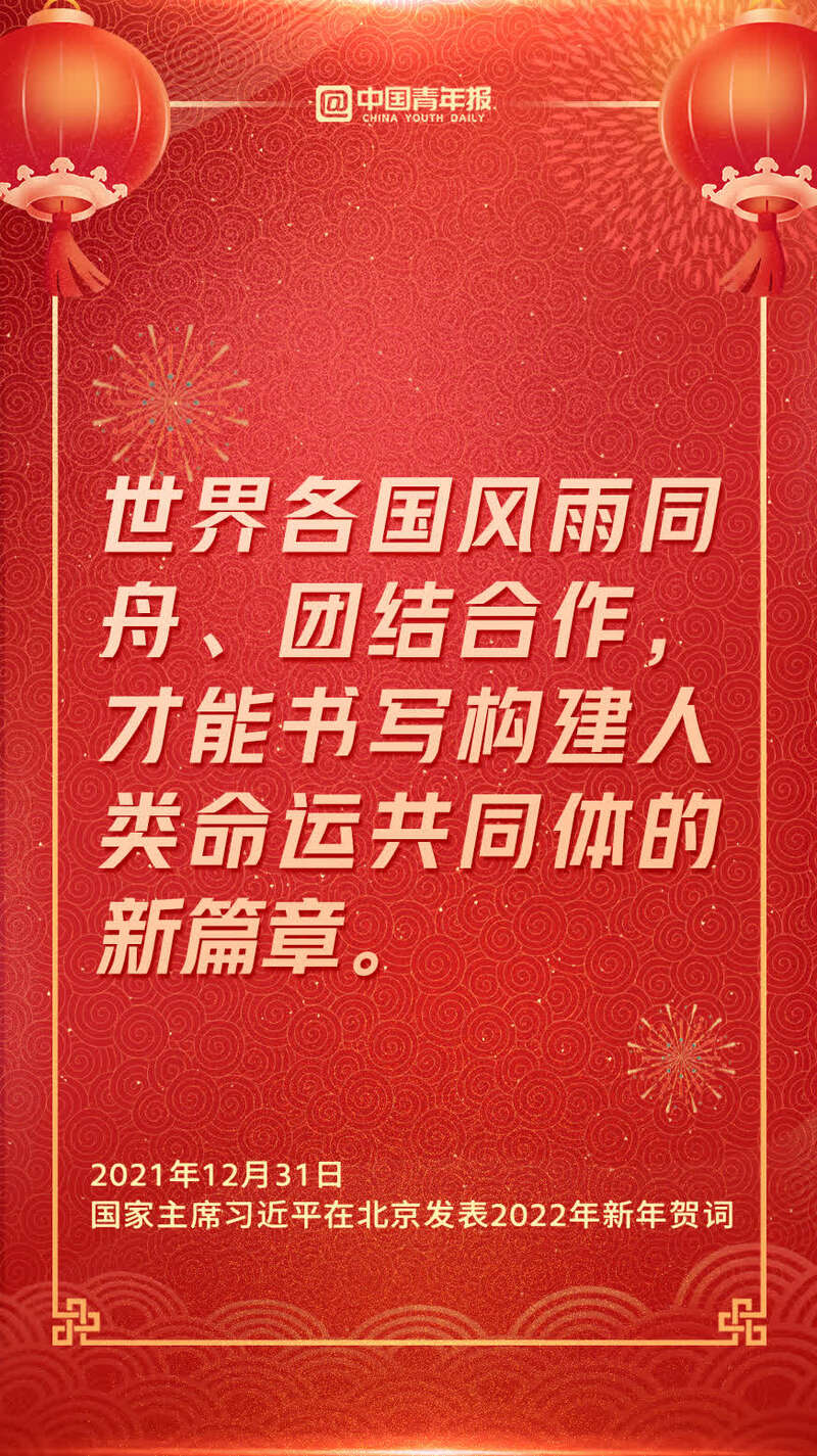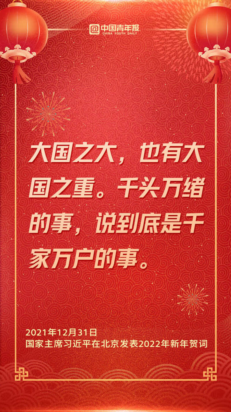新年前夕,国家主席习近平发表二〇二二年新年贺词。回首这一年,意义非凡。一个坚韧不拔、欣欣向荣的中国开启了全面建设社会主义现代化国家新征程,正昂首阔步行进在实现中华民族伟大复兴的道路上。新年的钟声即将敲响。收藏这份主席新年贺词金句,让我们一起向未来!祝福国泰民安!