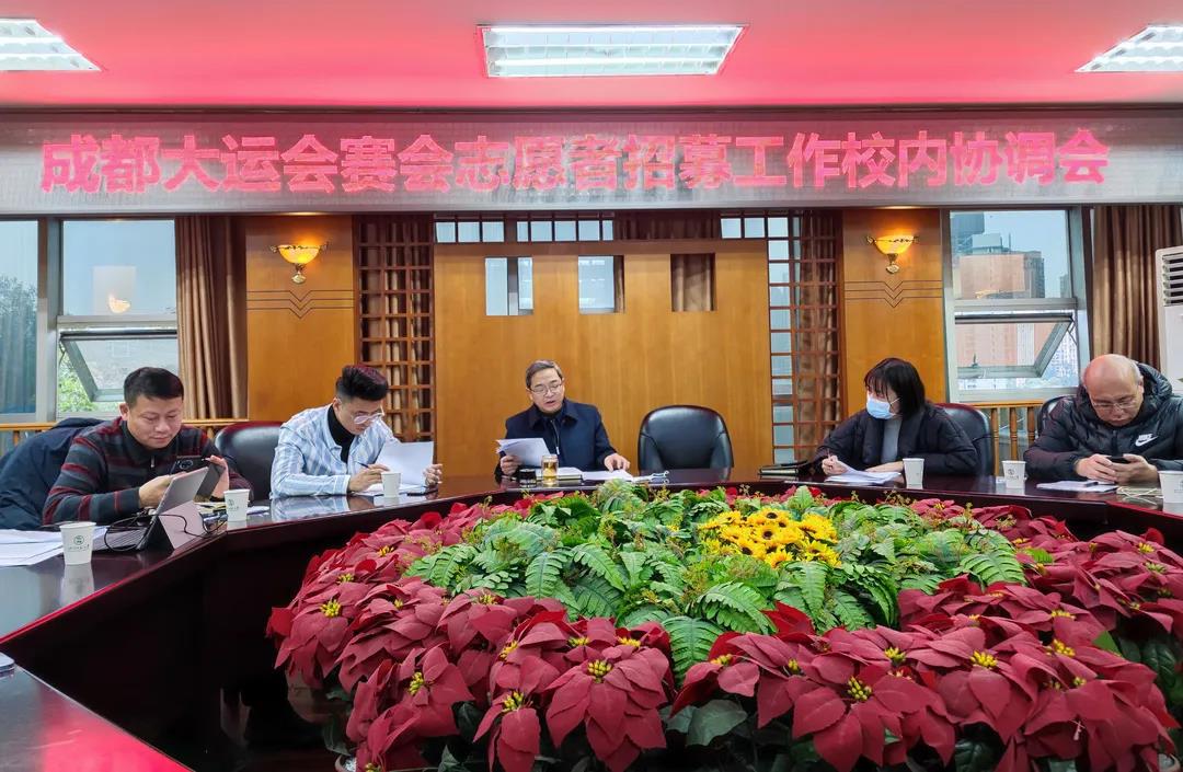 成都大运会志愿者部发布通知后,我校迅速响应,成立以校党委副书记黄钢威为组长的“四川师范大学大运会赛会志愿服务工作领导小组”。小组累计召开5次线下、4次线上工作推进会,统筹协调党政办公室、学生工作部(处)·武装部、校团委、人事处、教务处、计划财务处、后勤管理服务中心、体育学院(体育场馆中心)、音乐学院、舞蹈学院、服装与设计艺术学院等校内单位,对接大运会志愿者部、开闭幕式相关节目导演组、摄制组,为后续招募工作的顺利开展打下牢固基础。