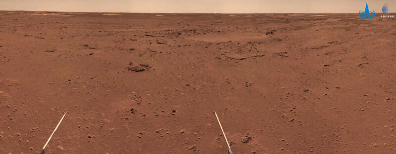 “祝融号”火星车拍摄火面地貌。该图像由“祝融号”火星车近期利用导航地形相机获取的3幅图像拼接镶嵌而成,图中可以看到环形坑、石块等火星典型地貌。