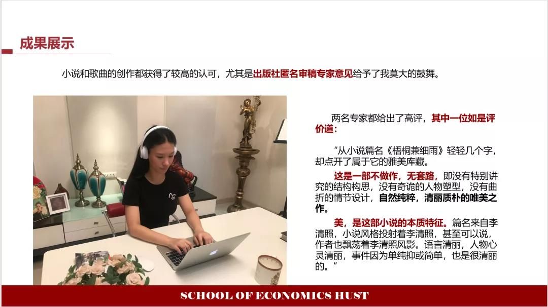 自2020年11月加入特优生大家庭以来,我充分感受到了学校学科交叉融合、自主学习、自主设计、激发潜能的个性化人才培养魅力。在导师的指导下,在经济学院和启明学院老师的共同打造下,我不仅得到经济、管理、英语文学的三重滋养,还更加自信地放飞了文学创作梦和大胆开启了跨领域音乐创作尝试。这些知识的汲取和实践的探索,使我更加笃信:责任、担当,创新、创造,有梦,并敢于追梦,才是我们青年人需要在大学获取的重要知识与能量。