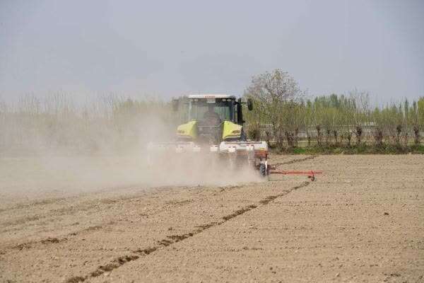 在乌兹别克斯坦费尔干纳州,技术人员驾驶拖拉机播种棉花。(来源:新华社)