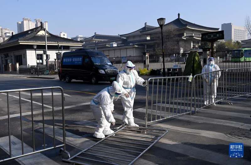 1月1日,西安市雁塔区小寨东路一社区执勤人员在摆放隔离栏杆。