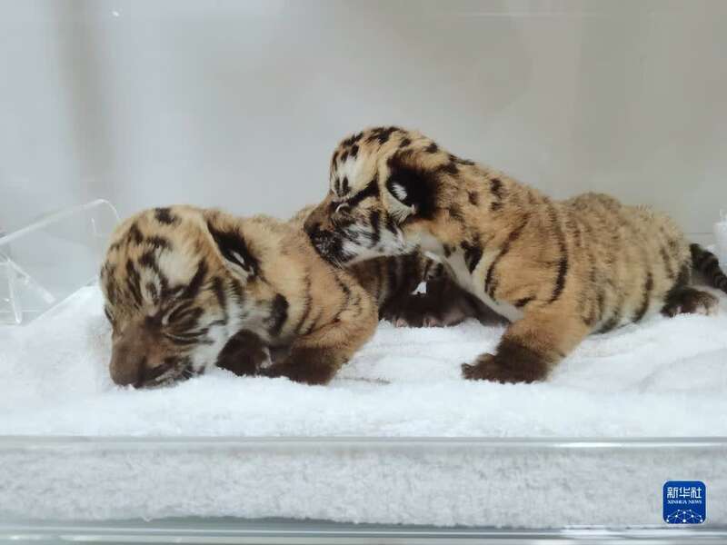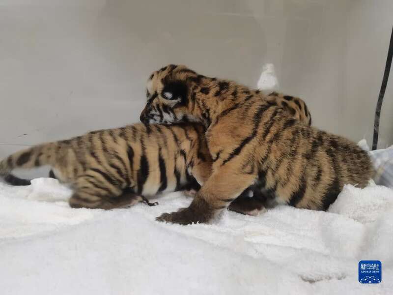 广东韶关华南虎繁育研究基地华南虎“梦梦”产下的两只华南虎幼崽(2022年1月1日摄)。新华社发