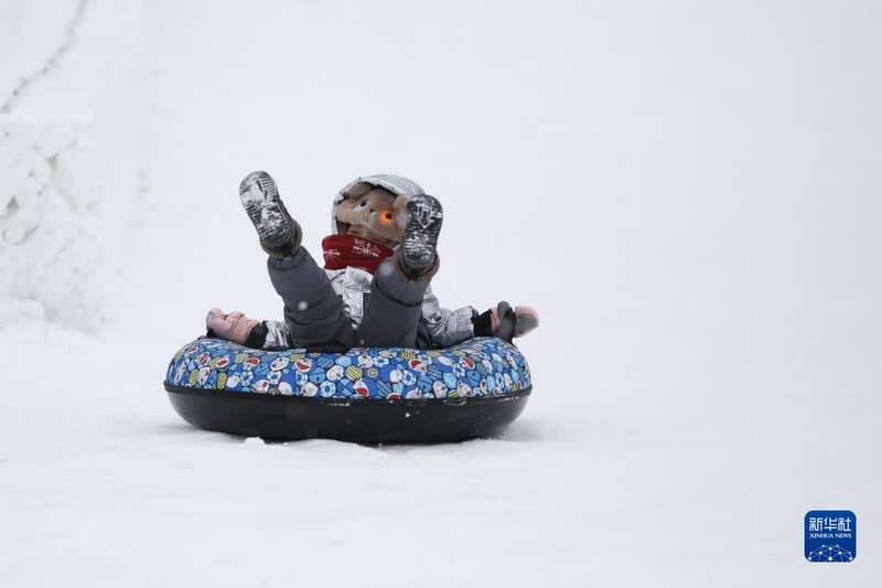 1月1日,小朋友在哈尔滨松花江上的一处冰雪娱乐园区玩雪圈。