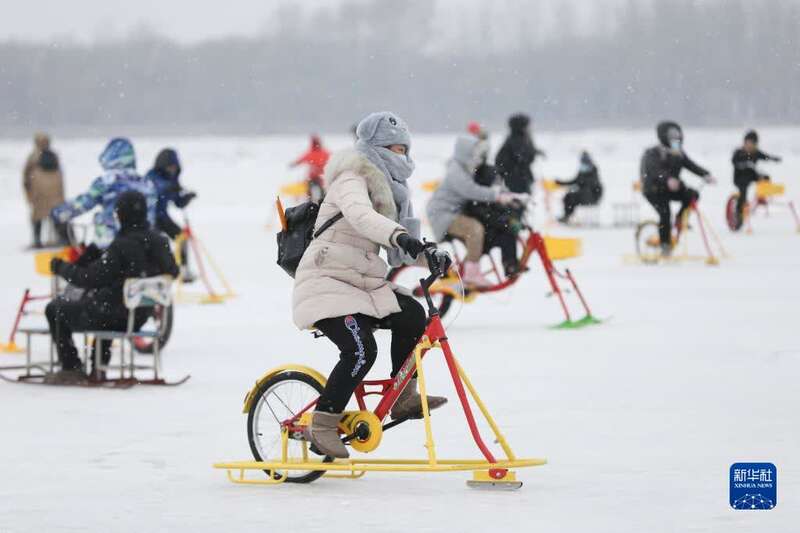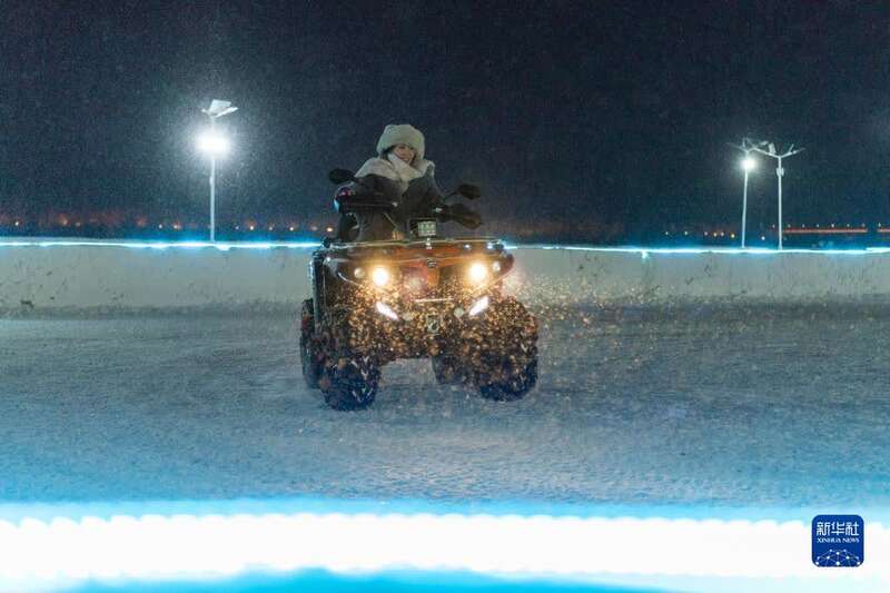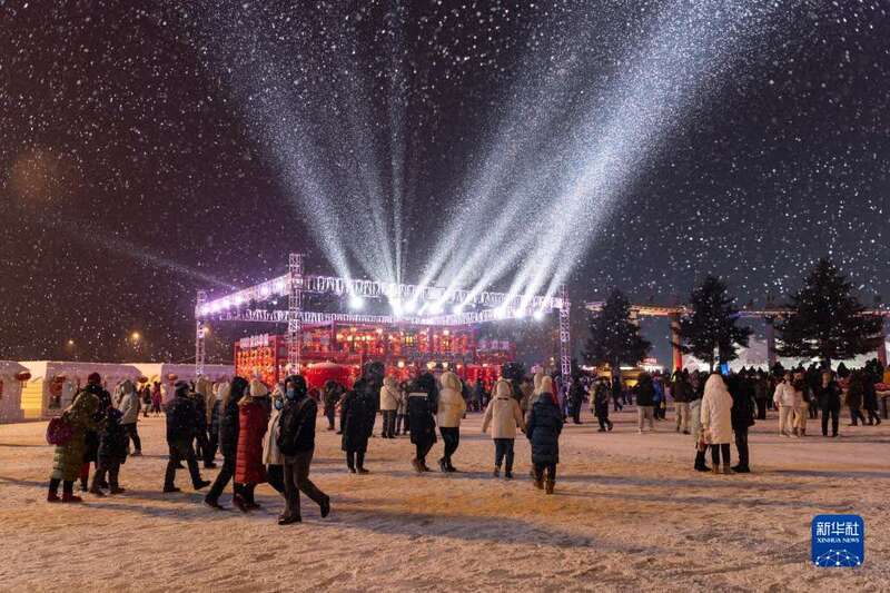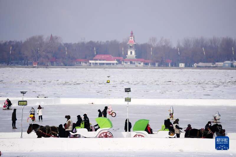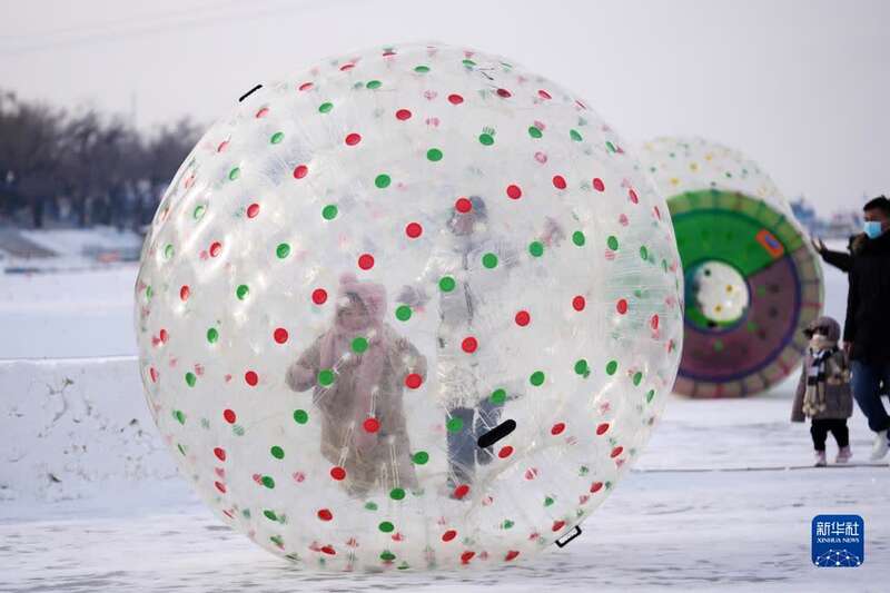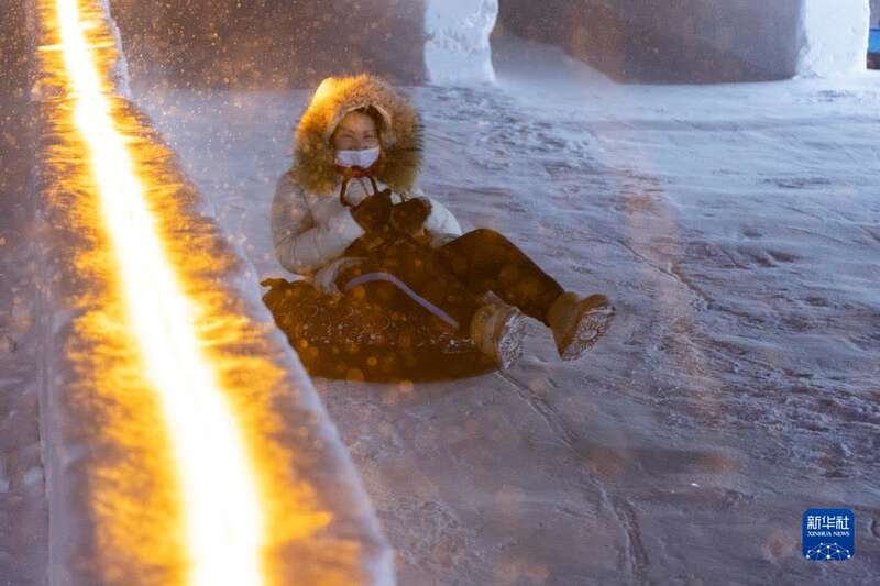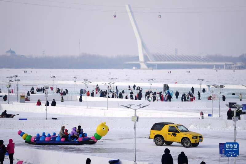 1月1日,人们在哈尔滨松花江上的一处冰雪娱乐园区游玩。