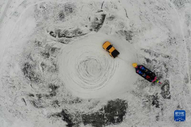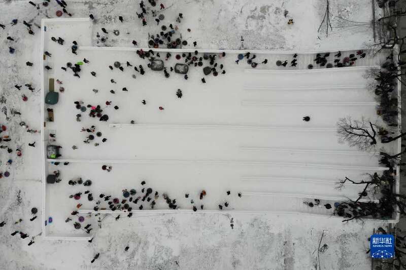 1月1日,人们在哈尔滨松花江上的一处冰雪娱乐园区游玩(无人机照片)。