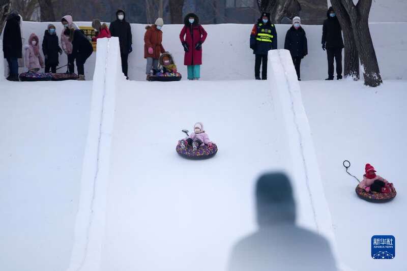1月1日,小朋友在哈尔滨松花江上的一处冰雪娱乐园区游玩。