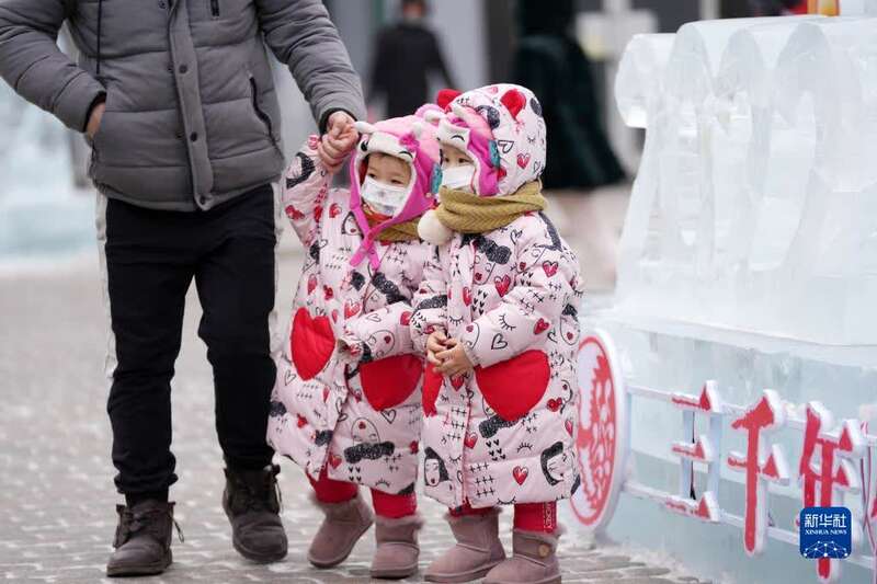 当日是2022年第一天,许多市民和游客在黑龙江省哈尔滨市的冰天雪地里赏冰玩雪,庆祝新年。