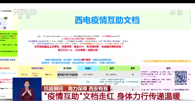 因为疫情,“宅”变成了生活的主题,但很多人并没有真正“宅”着。前几天,西安电子科技大学大三学生高永凯创建了一份“疫情互助”的文档,放进校园聊天群里。没想到,文档成了封闭管理期间学生的“宝典”。使用的人越来越多,文档里服务内容也愈加丰富。短短3天访问量超过20万,高永凯说,“面对困难,与其袖手旁观,不如身体力行。”。